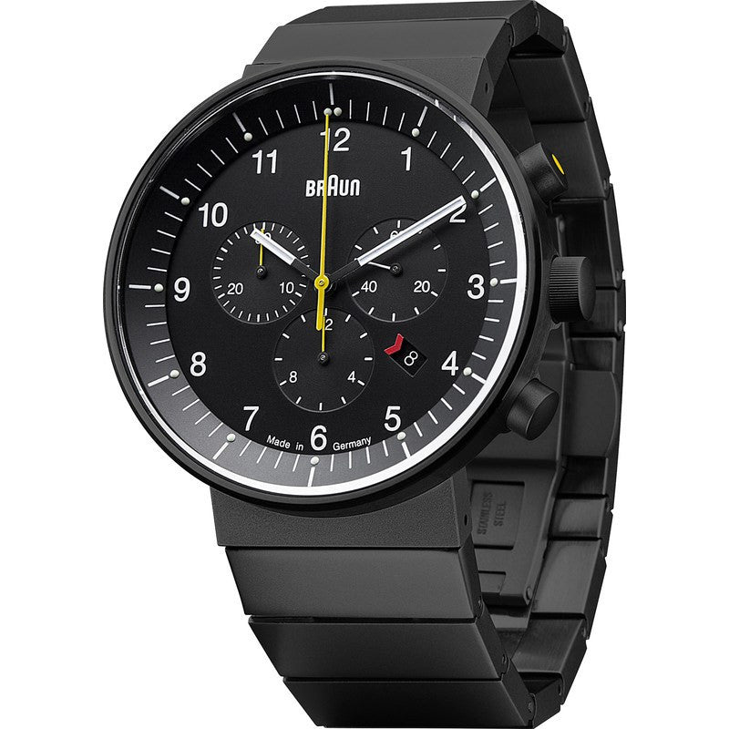 The Braun Prestige Chronograph Men's Watch is the epitome of a great men's wristwatch. Its sleek black design is carved out of one single block of steel. This one-piece construction eliminates the need for a case-back. The Swiss movement is mounted into the case from the top before being covered and sealed by the sapphire crystal and in turn removes the element of potential leakage. The bottom part of the watch is tapered stylishly and the band lugs are attached with a new method not seen in conventional watch construction. The Braun Prestige fashion men's watch has a 2 year warranty.
