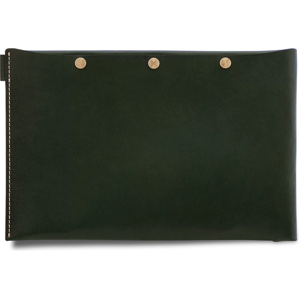 Luxurious Horween leather is complemented by six sturdy brass snaps and hand-stitched detailing. The fasteners allow the bag to completely open along two sides, providing easy access to its contents. You can set the bag on its side or hang it from one of three large rivets across the top.
