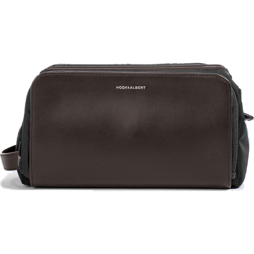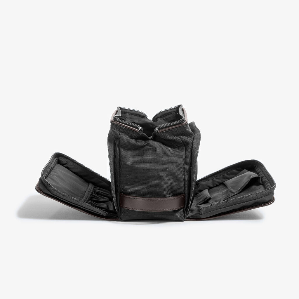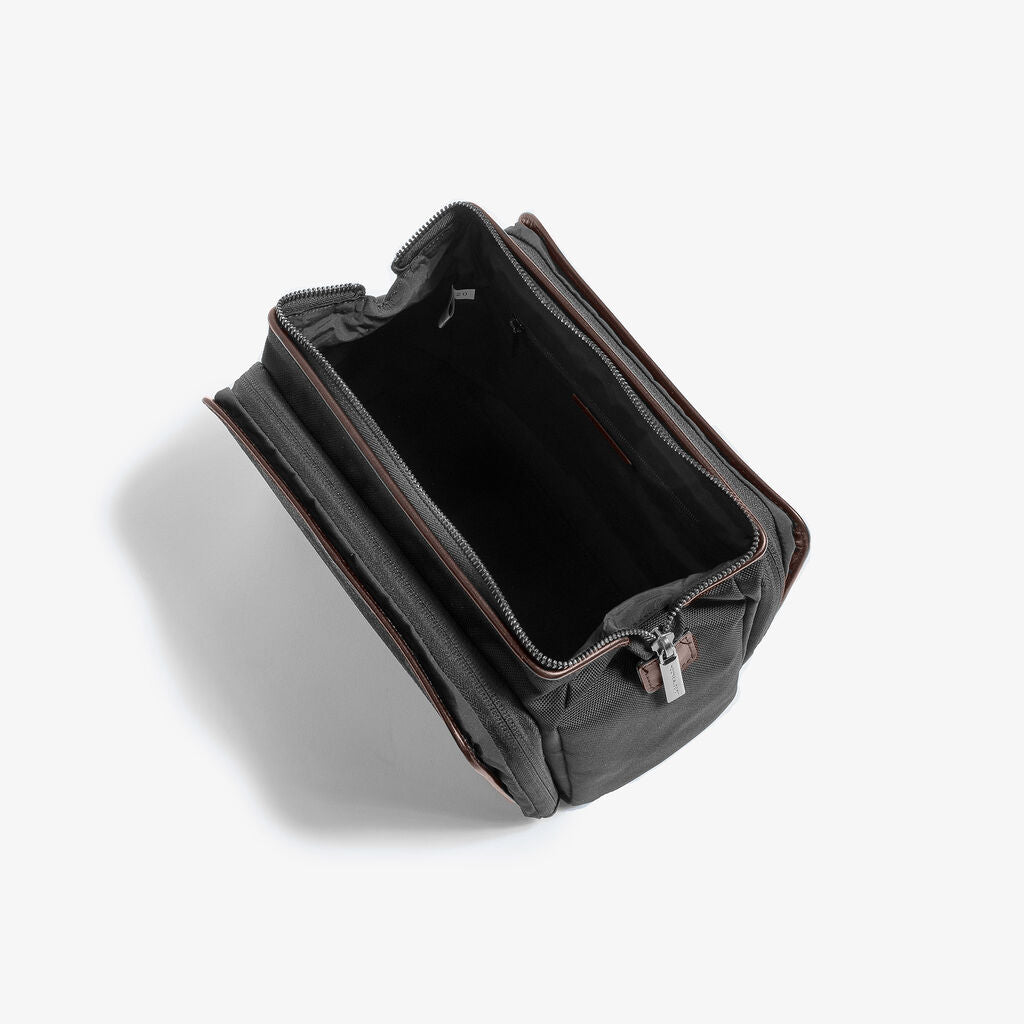 The exterior is made from a top-grain leather. A single main opening for easy access to your larger items with a small internal zip pocket for additional storage. The two side compartments house pockets for all of the little things for your travels.