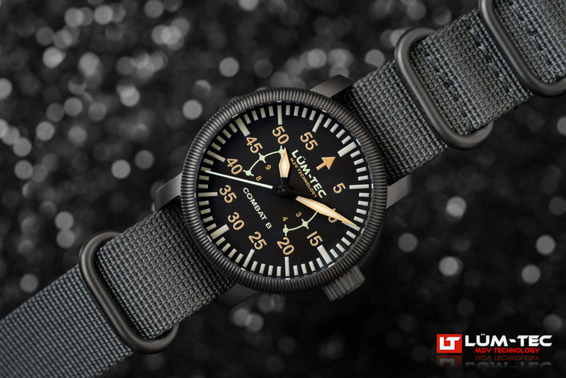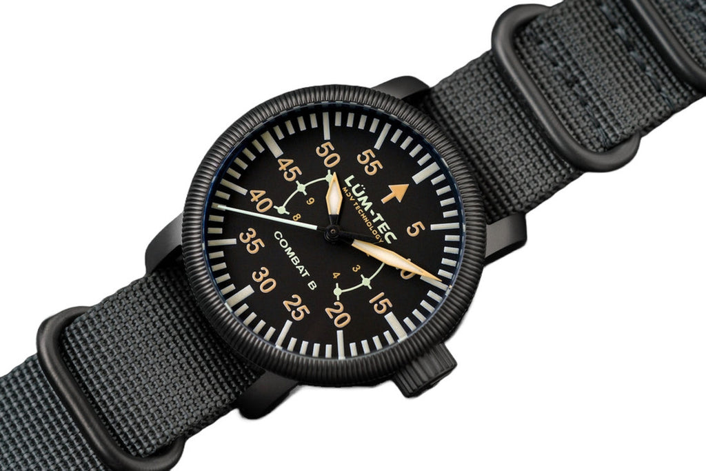 LUM-TEC B62 Automatic Watch: 39mm hand-assembled in Ohio, featuring a forged and heat-treated 316L surgical grade stainless steel case with titanium carbide gunmetal PVD hard coating and an anti-fingerprint finish. The case is 12.9mm thick, with a lug-to-lug length of 46mm and a 20mm lug width. It offers 200 meters of water resistance and is powered by a 28,800 BPH Miyota 9039 Japan ultra-slim automatic movement, which includes hacking and hand-winding features. The movement is timing adjusted in six positions for maximum accuracy and mounted with an anti-shock system. The watch has a curved sapphire crystal with military-grade inner AR coating and a threaded solid caseback. The threaded crown has double diamond seals and high-tech Viton® gaskets. It comes with two military-style straps: one charcoal gray nylon and one tan leather, both with gunmetal PVD hardware. The dial features an all-metal base with a bead-blasted matte PVD black finish, and a diamond-cut premium handset with back-filled X1 C3 luminous application.