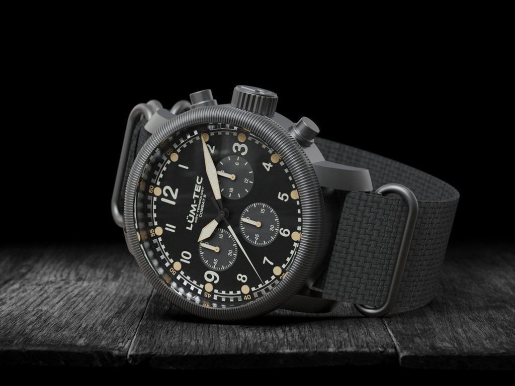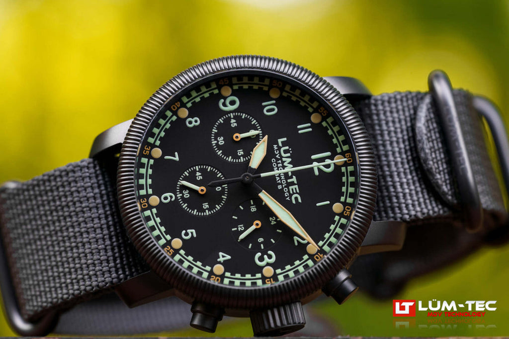 The LUM-TEC B63 CHRONO is a handcrafted watch from Ohio, featuring a 39mm case of 316L surgical grade stainless steel with a titanium carbide gunmetal PVD coating and anti-fingerprint finish. It includes a 13.4mm thick domed sapphire case, 46mm lug-to-lug length, and 200 meters water resistance. Powered by the Miyota Japan OS20J Chronograph movement, it has an anti-shock mounting system, a curved sapphire crystal with military-grade AR coating, and a threaded solid caseback and crown with double diamond seals. The all-metal dial has a bead-blasted matte PVD black finish with diamond-cut premium hands and X1 C3 luminous application. It comes with two military-style straps, charcoal gray nylon and tan leather, with gunmetal PVD hardware. Using MDV® luminous Technology, the watch features vintage patina radium color with high luminous reactivity. It offers lifetime free battery replacement, seal cleaning, and pressure testing, and is limited to a numbered series of 300 worldwide with a 2-year limited warranty.