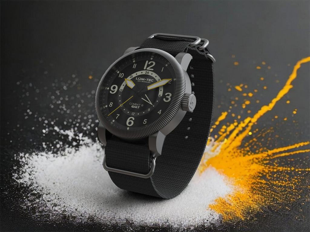 The LUM-TEC Combat B59 GMT Automatic Watch is a finely crafted timepiece, designed and assembled by hand in Ohio. It features a 43mm case of forged and heat-treated 316L surgical-grade stainless steel with a titanium carbide gunmetal PVD coating and anti-fingerprint treatment. With 200 meters of water resistance, a 22mm lug width, and powered by the precise 28,800 BPH True GMT Miyota Japan 9075 automatic movement, it ensures accurate timekeeping, enhanced by adjustments in six positions. The watch includes a curved sapphire crystal with inner AR coating, high-tech Viton® gaskets, and a threaded solid caseback and crown with double diamond seals. It comes with two military-style straps (charcoal gray nylon and tan leather), an all-metal dial base with a matte PVD black finish, and diamond-cut hands with X1 C3 luminous application. Limited to 300 pieces worldwide, it includes lifetime free timing adjustment.