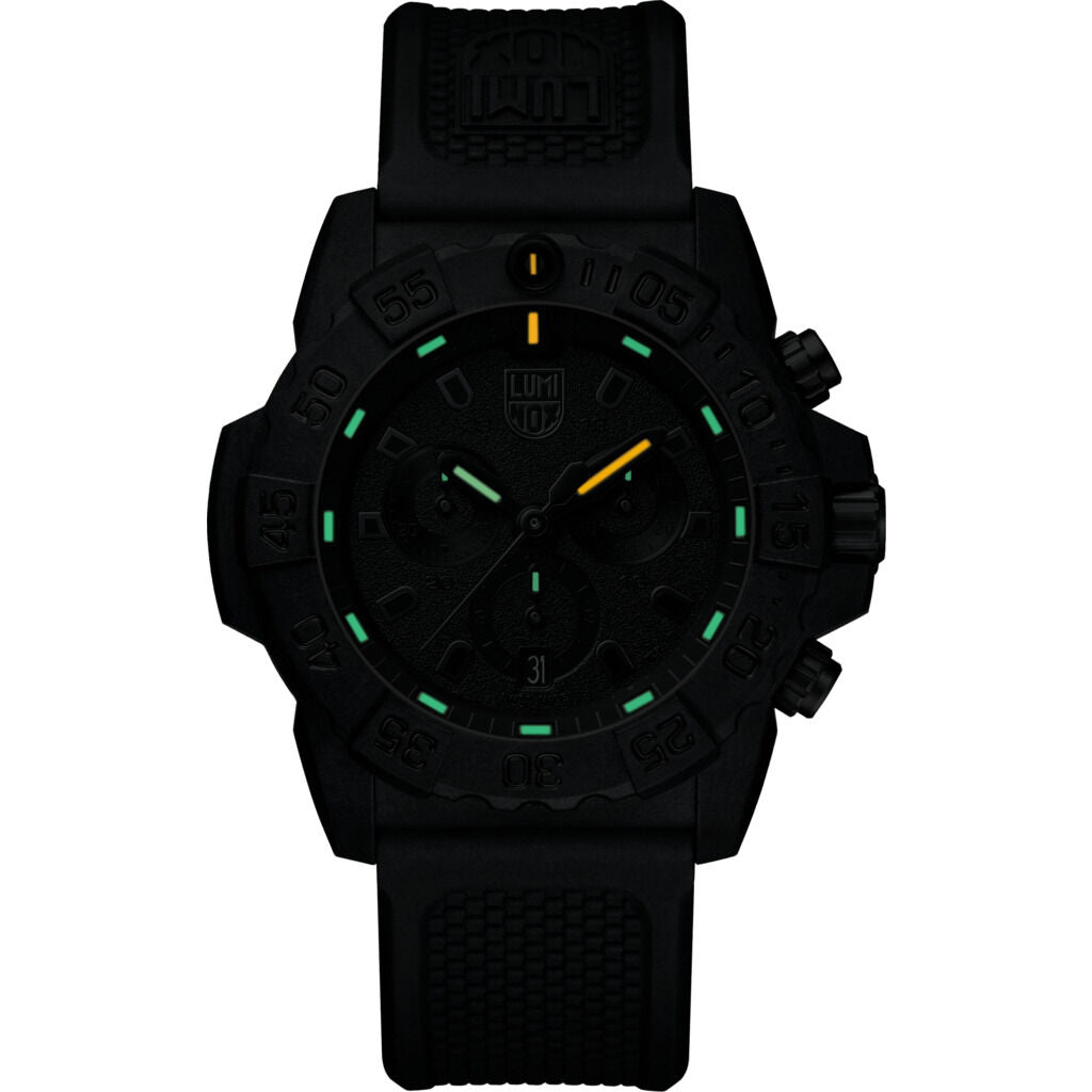 The water-resistant Luminox 3581 BO watch is part of the Navy SEAL series. Designed with a sapphire anti-reflection coating, this Navy SEAL series watch can endure performances 660 feet underwater. The watch is equipped with Luminox signature black rubber straps and the steel brushed IP black signature buckle. CARBONOX™